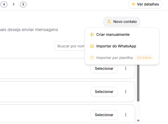 - Você encontrará três modos de importação, Criar Manualmente, Importar do WhatsApp e Importar por Planilha, selecione a opção desejada.