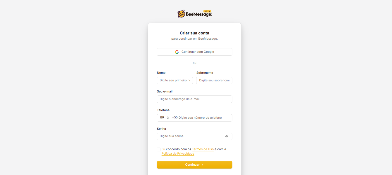 1️⃣ Acesse o site do BeeMessage e faça seu cadastro gratuito.
